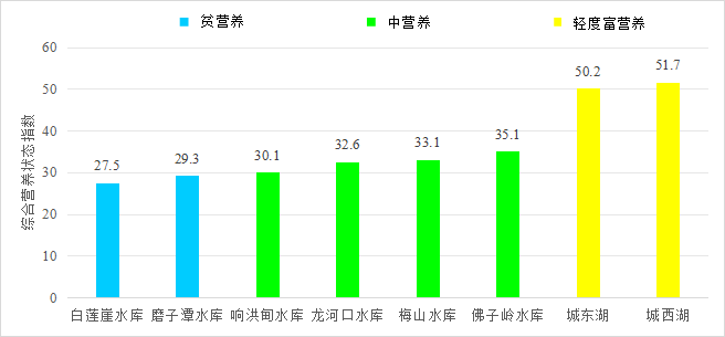 全市监测的8个湖库中,水质为优的6个,占75.0%;水质为良的1个,占12.5%;水质为轻度污染的1个,占12.5%。监测营养状态的8个湖库中,贫营养状态的2个,占25.0%,中营养状态的4个,占50.0%,轻度富营养状态的2个,占25.0%。