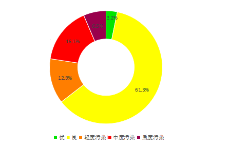 1月份,六安市城区空气质量优良率为64.5%,其中空气质量为优的天数为1天,占3.2%;为良的天数19天,占61.3%,轻度污染4天,占12.9%,中度污染5天,占16.1%;重度污染2天,占6.5%;无严重污染天气。与上月相比,空气质量优良天数比例下降16.1个百分点;与上年同期相比,空气质量优良天数比例下降3.2个百分点。