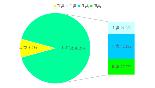 1月,全市地表水总体水质状况为优,监测的47个断面中,Ⅰ~Ⅲ类水质断面比例为91.5%(43个),Ⅳ类8.5%(4个)。