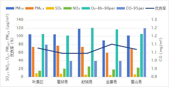 1月份,六安市各县区空气质量优良率范围为58.1%(霍邱县、舒城县)~80.6%(金寨县),平均优良率为67.1%。