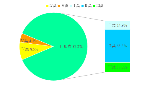 2月,全市地表水总体水质状况为良,监测的47个断面中,Ⅰ~Ⅲ类水质断面比例为87.2%(41个),Ⅳ~Ⅴ类12.8%(6个)。