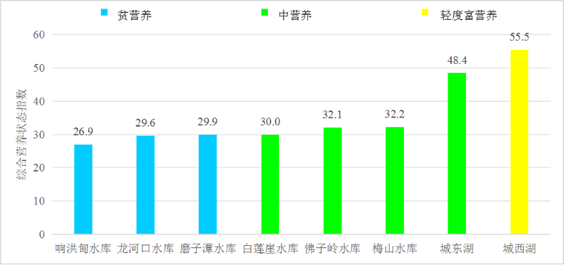全市监测的8个湖库中,水质为优的7个,占87.5%;水质为轻度污染的1个,占12.5%。监测营养状态的8个湖库中,贫营养状态的3个,占37.5%,中营养状态的4个,占50.0%,轻度富营养状态的1个,占12.5%。
