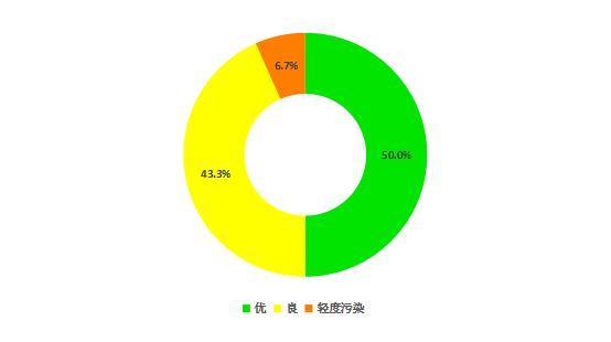 6月份,六安市城区空气质量优良率为93.3%,其中空气质量为优的天数15天,占50%;为良的天数13天,占43.3%;轻度污染2天,占6.7%;无中度污染及以上天气。与上月相比,空气质量优良天数比例上升9.4个百分点;与上年同期相比,空气质量优良天数比例上升30个百分点。