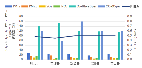 6月份,六安市各县区空气质量优良率范围为90%(霍邱县)~100%(舒城县、霍山县、金寨县),平均优良率为97.3%。