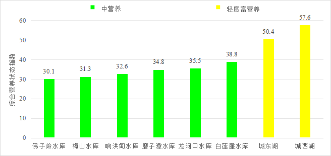全市监测的8个湖库中,水质为优的6个,占75.0%;水质为良的1个,占12.5%;水质为中度污染的1个,占12.5%。监测营养状态的8个湖库中,中营养状态的6个,占75.0%,轻度富营养状态的2个,占25.0%。