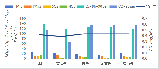 7月份,六安市各县区空气质量优良率范围为96.8%(叶集区、霍邱县)~100%(舒城县、霍山县、金寨县),平均优良率为98.4%。