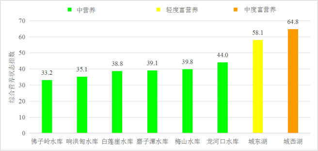 监测营养状态的8个湖库中,中营养状态的6个,占75.0%,轻度富营养状态的1个,占12.5%,中度富营养状态的1个,占12.5%。