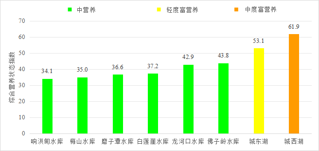监测营养状态的8个湖库中,中营养状态的6个,占75.0%,轻度富营养状态的1个,占12.5%,中度富营养状态的1个,占12.5%。