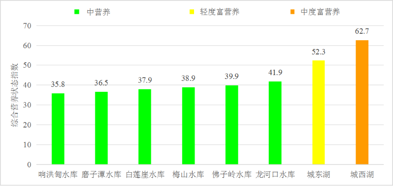 监测营养状态的8个湖库中,中营养状态的6个,占75.0%,轻度富营养状态的1个,占12.5%,中度富营养状态的1个,占12.5%。