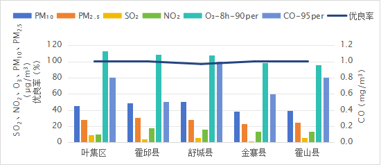 10月份,六安市各县区空气质量优良率范围为96.8%(舒城县)~100%(霍邱县、霍山县、金寨县、叶集区),平均优良率为99.4%。