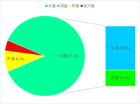 10月,全市地表水总体水质状况为良,监测的47个断面中,Ⅰ~Ⅲ类水质断面比例为87.2%(41个),Ⅳ类8.5%(4个),劣Ⅴ类4.3%(2个)。