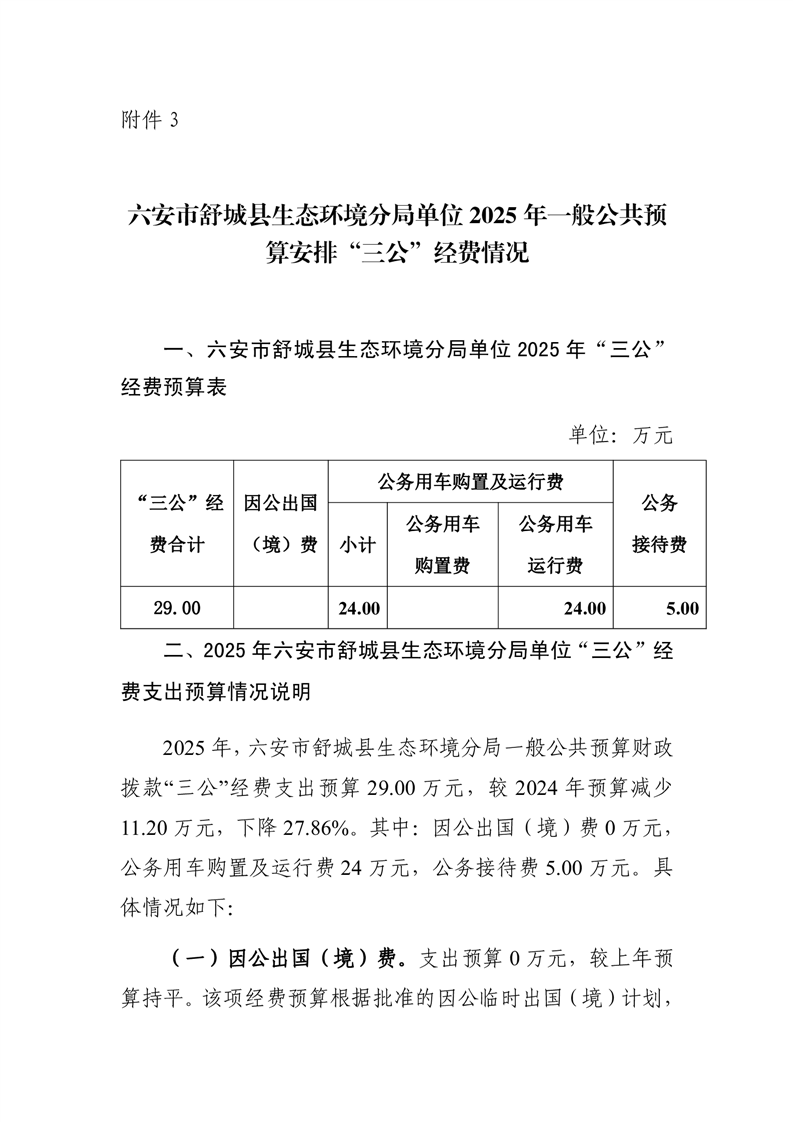 六安市舒城县生态环境分局单位2025年一般公共预算安排“三公”经费情况公开