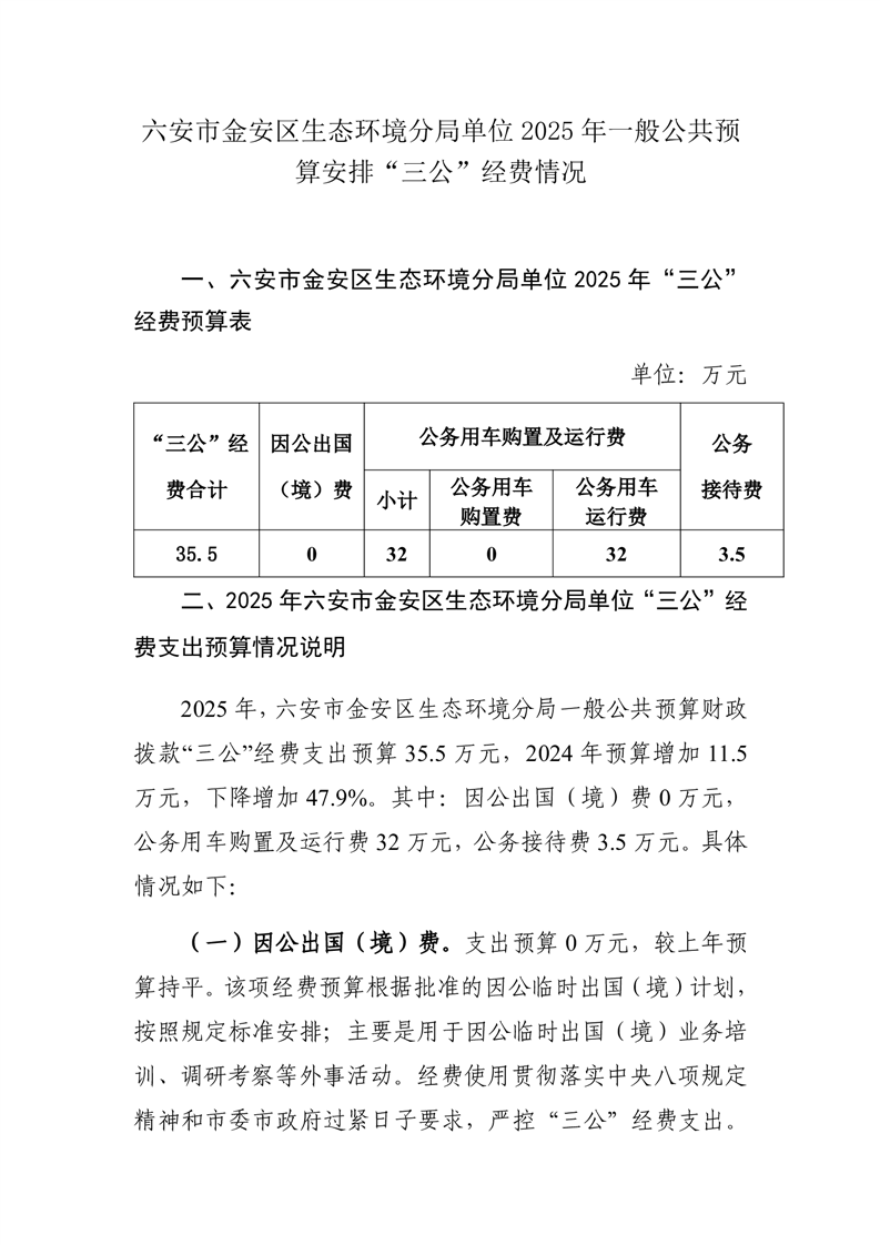 六安市金安区生态环境分局单位2025年一般公共预算安排“三公”经费情况公开