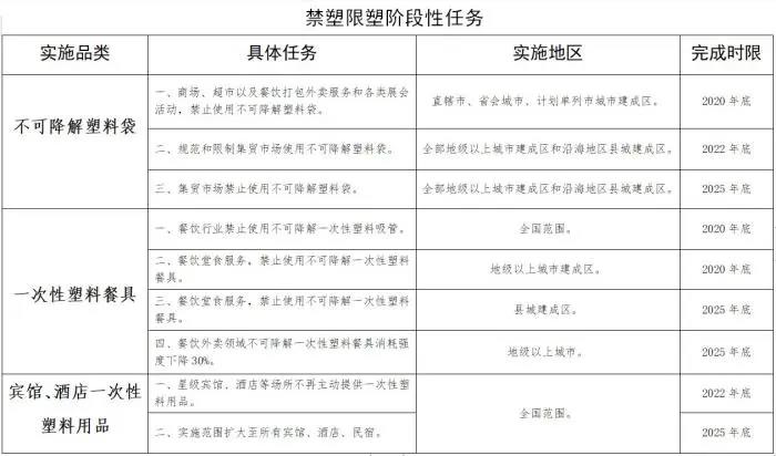 近日,商务部办公厅发布关于进一步加强商务领域塑料污染治理工作的通知,公布禁塑限塑阶段性任务,要求: