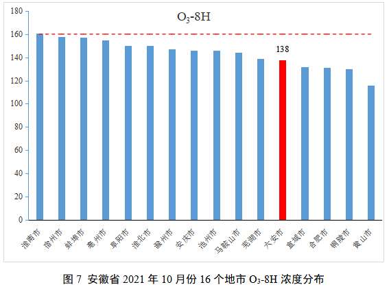 如图7、图8所示,10月份六安市优良天数为31天,高于全省(29天)均值6.9个百分点,同比增加2天,空气质量优良率为100%,并列全省第1名。O3-8H月浓度为138μg/m3,低于全省(143.8μg/m3)均值4.0个百分点,同比上升3.0%。