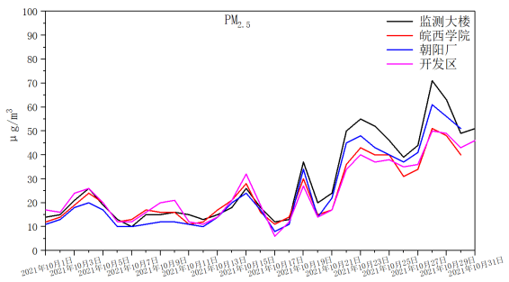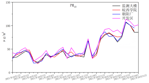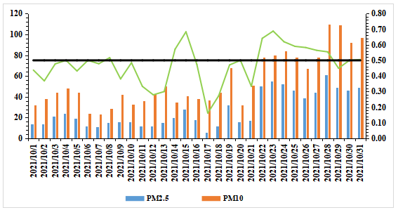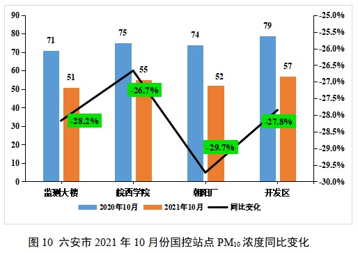监测数据显示2021年10月各站点PM2.5浓度较2020年10月同期均有所改善。从国控站点PM2.5、PM10月均浓度水平分析来看,10月份各站点PM2.5月均浓度均不高,且相差不大,其中,朝阳厂和开发区站点PM2.5浓度下降幅度较大,分别达到43.2%、41.5%。各站点PM10浓度从高到低排名依次是开发区、皖西学院、朝阳厂、监测大楼,月均浓度分别为57μg/m3、55μg/m3、52μg/m3、51μg/m3,各站点较去年同期分别下降27.8%、26.7%、29.7%和28.2%。各站点PM2.5及PM10较去年同期均有下降,且下降较为明显,秋冬季应继续关注粗细颗粒物浓度,严查各企业周边筑施工扬尘、道路扬尘污染源影响。