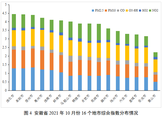 如图4所示,10月份六安市环境空气质量在安徽省处于上游水平,综合指数为3.29,同比下降23.3%,排全省第4名,空气质量较同期有较大改善。