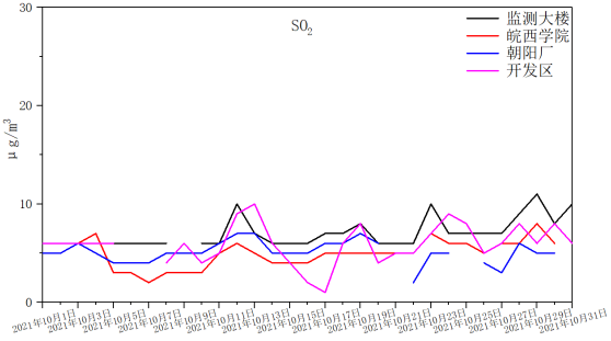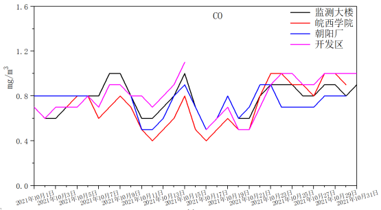 下图11为六安市4个空气质量国控站点10月份PM2.5、PM10、SO2、NO2、CO、O3浓度的时间序列图。从四站点浓度变化曲线可以看出,本月开发区站点PM10浓度多次出现高于其他站点的情况,监测大楼PM2.5浓度明显高于其他站点,且持续时间较长,开发区站点位于六安市北部,颗粒物浓度较为突出。针对颗粒物浓度的变化,建议我市在污染传输期间重点减少本地污染源(工地扬尘、机动车尾气、散煤燃烧、餐饮油烟等)排放对空气质量的叠加影响。监测大楼站点在早晚高峰内协调交警部门对易拥堵路段做好交通疏导工作,避免道路拥堵、汽车怠速行驶,并对周围施工工地进行巡查,确保施工工地严格落实“六个百分百”和“两个全覆盖”,在施工过程中将降尘抑尘措施落实到位。