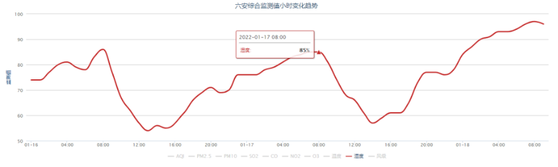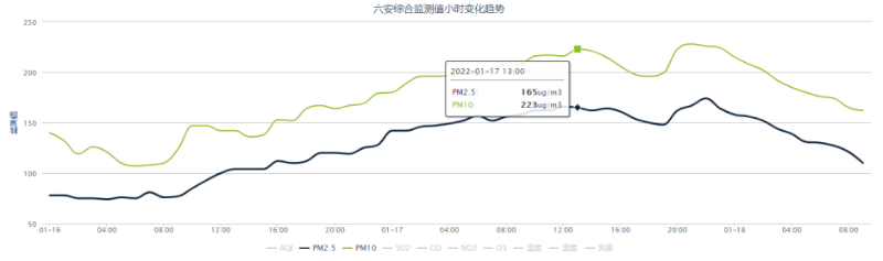 根据气象条件,污染污染发生期间,六安本地湿度较高,日均湿度70%左右,仅午间湿度低于60%,湿度高不利于污染物扩散,且加剧本地二次污染粒子的生成;污染传输期间,我市风向变化较大,风向出现北风→东北风→东风→静稳天气→东北风的转变过程。综合,六安市气象条件非常不利于污染扩散,同时,受六安市南部大别山区域阻挡,导致颗粒物在本地聚集积累,长期处于重度污染级别。