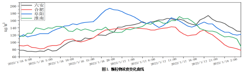 图1可知,1月16日早8时开始,六安市颗粒物浓度出现浓度数值上升过程,持续至17日13时上升至高值,且数值较高,13时PM2.5:165ug/m3,PM10:223ug/m3,此时我市受东北风影响,上游城市持续输送,颗粒物出现持续高值现象,一直保持在重点污染水平(150ug/m3以上),至18日夜间4时有所下降,但数据仍保持在较高水平(100ug/m3以上)。与周边城市相比,16日0时我市处于周边城市最低水平,传输期间我市颗粒物浓度持续上升,数据仍低于淮南、阜阳,17日6时至19时,六安市、淮南市、阜阳市颗粒物浓度均处于较高水平,且数据相差不大,随后我市颗粒物浓度二次上升,淮南、阜阳出现下降趋势。