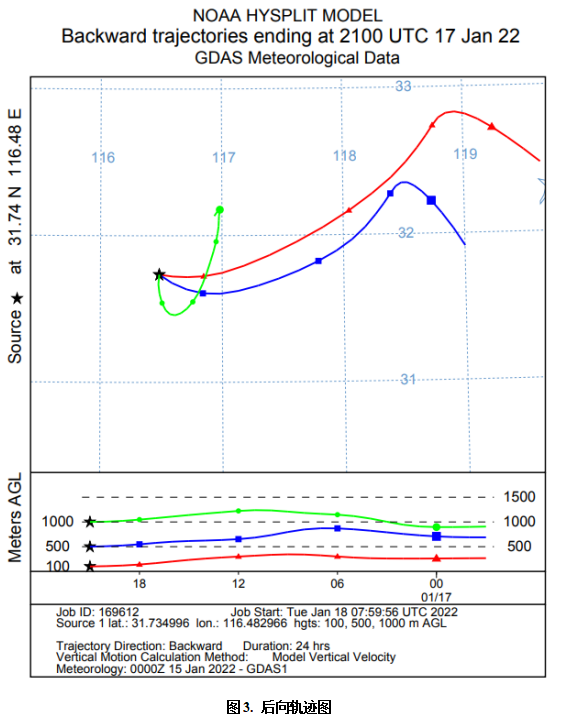 下图为六安市1月17日13时的后向轨迹图,从图中可以看出,六安市近地面风向主要东风、东北风,高空以北风转南风。