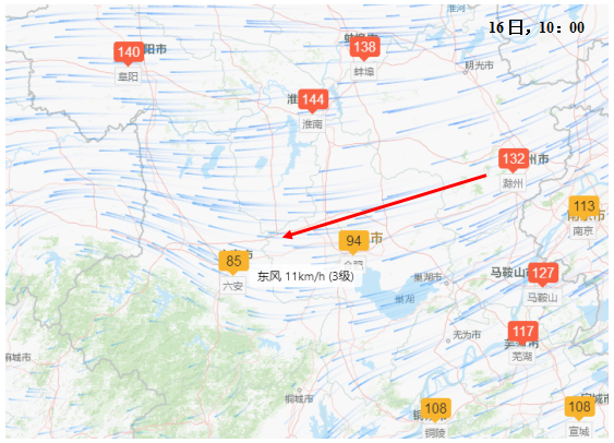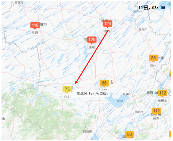 16日03:00-07:00,蚌埠——淮南——六安(东北风);