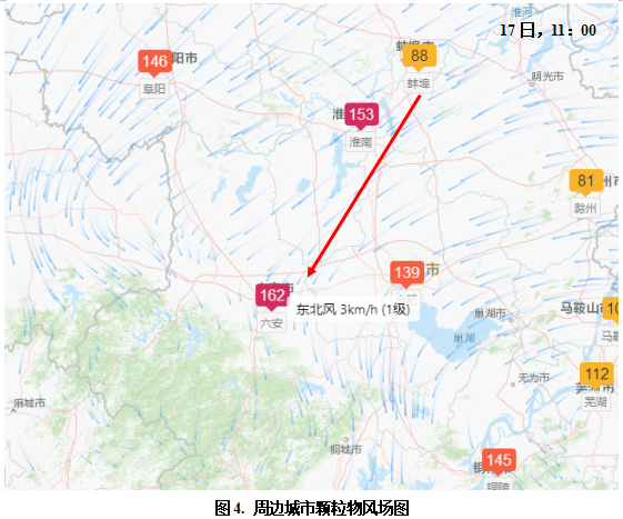 根据风场图分析,可以直观看出本次颗粒物污染传输通道主要为:蚌埠——淮南——六安、滁州——合肥——六安、淮南——六安。