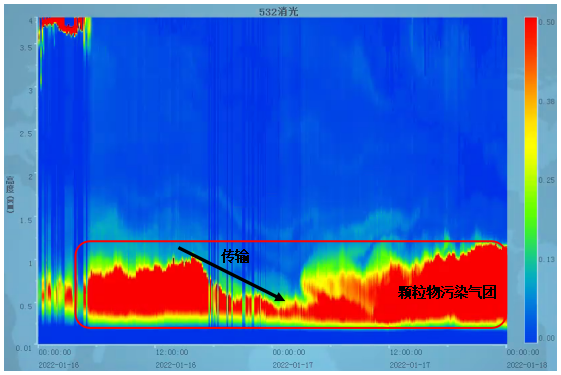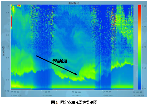分析固定点激光雷达监测图(图5)可知,污染发生期间,图谱显示主要为气溶胶传输特征区域,1月16日夜间3时,1.5km左右高空出现传输通道,随后开始聚集,此传输通道不仅为细颗粒物传输,伴随粗颗粒物传输,在17日0时开始,0.5km左右范围内,主要为浓度较高的气溶胶颗粒污染气团(消光系数高,退偏振比低),导致PM2.5浓度本地积累,至13时累计达到最高值,并扩散至1km左右高空,且持续至18日。