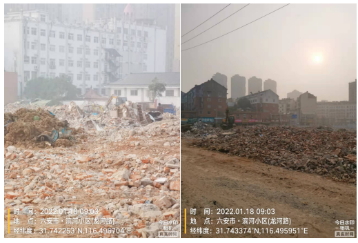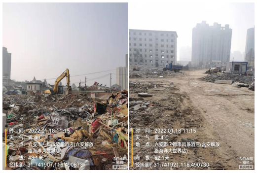 3、解放南路和龙河路交叉口西北侧拆迁工地,拆迁建材、垃圾未覆盖,挖掘机未湿法作业,内部道路积尘严重,无喷淋等降尘措施。