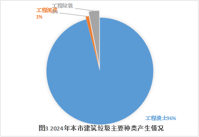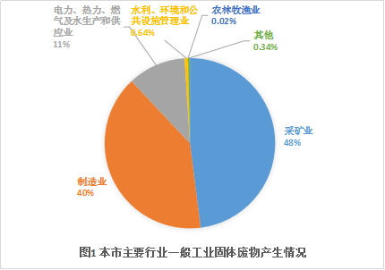2024年,一般工业固体废物产生量排名前5的行业依次为采矿业、制造业、电力热力燃气及水生产和供应业、水利环境和公共设施管理业、农林牧渔业,分别占全市一般工业固体废物产生量的48%、40%、11%、0.64%、0.02%,详细情况见图1。