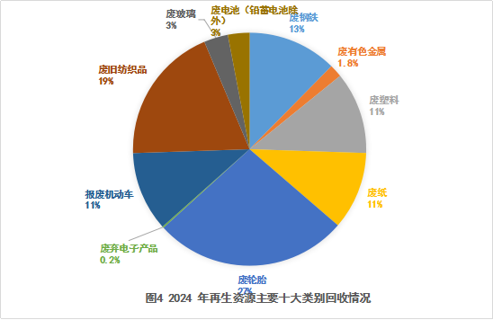 2024年,本市再生资源回收总量为42.02万吨,其中废钢铁、废有色金属、废塑料、废纸、废轮胎、废弃电器电子产品、报废机动车、废旧纺织品、废玻璃、废电池(铅蓄电池除外)等十大类别的再生资源回收总量为40.3万吨,占再生资源回收总量的99%。2024年再生资源主要十大类别回收情况见图4。
