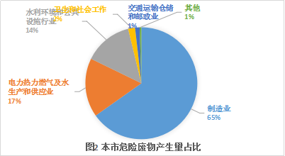 2024年,本市危险废物产生量排名前五的行业依次为制造业、电力热力燃气及水生产和供应业、水利环境和公共设施行业、卫生和社会工作、交通运输仓储和邮政业,分别占全市危险废物产生总量的65.2%、17.0%、14.0%、2.0%、1.3%,详细情况见图2。