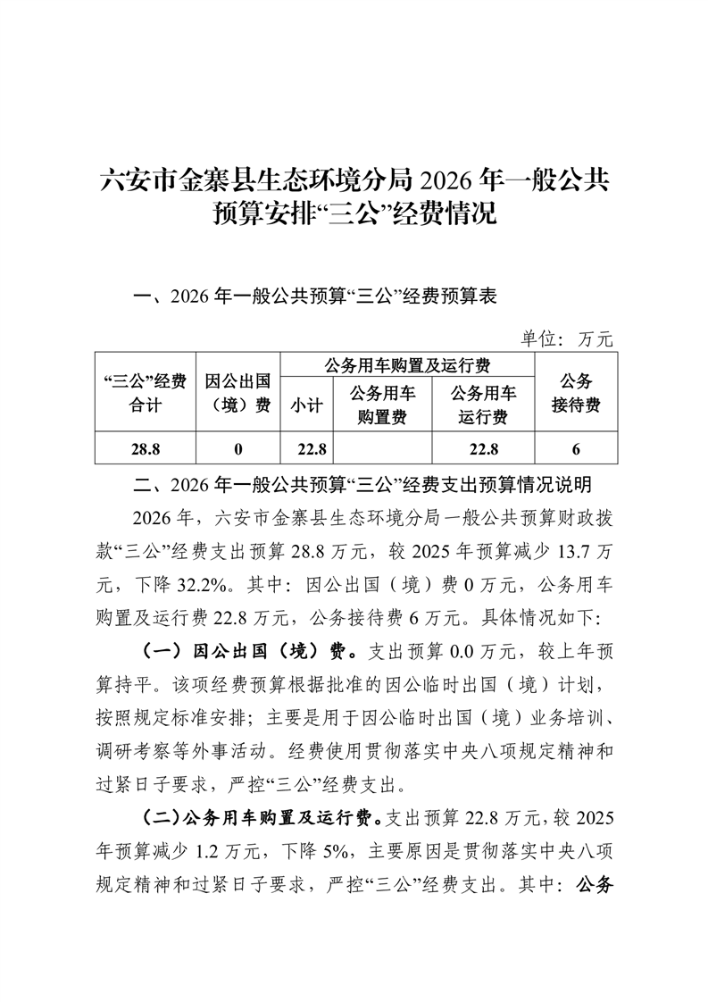 六安市金寨县生态环境分局2026年一般公共预算安排“三公”经费情况