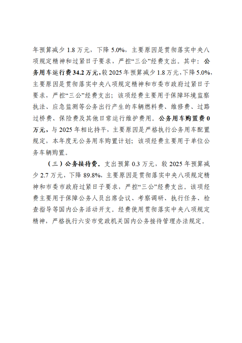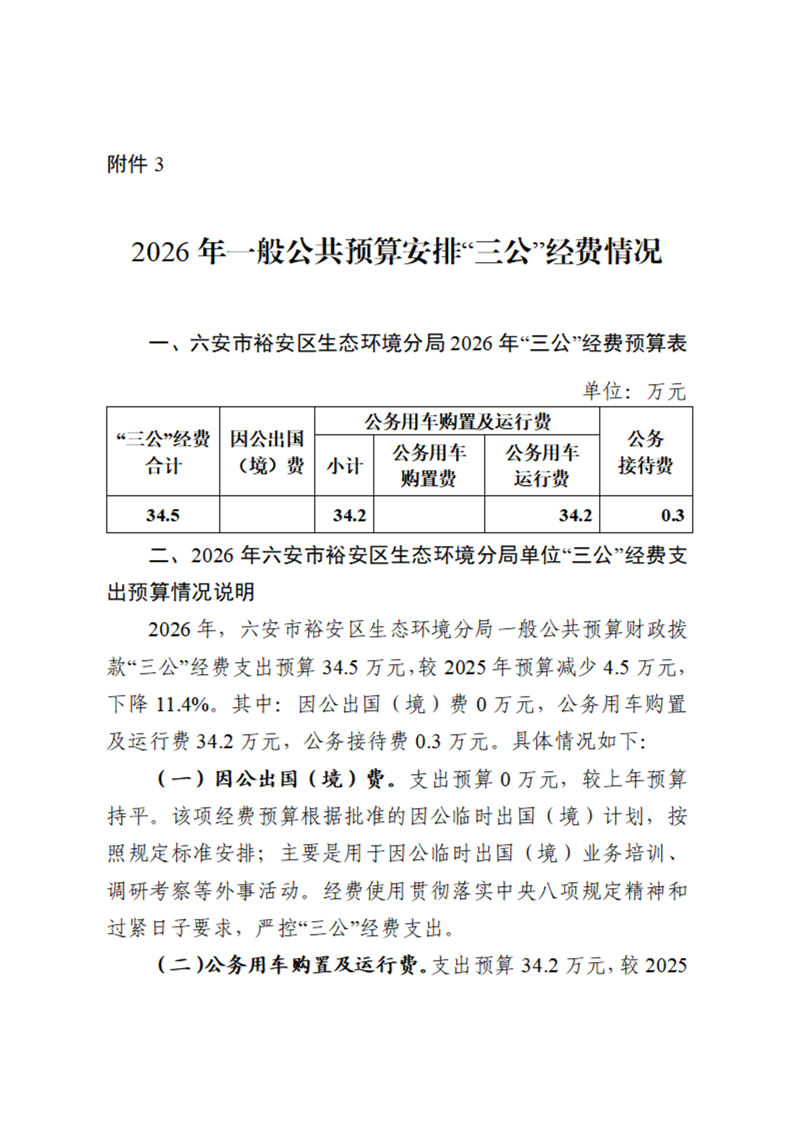 六安市裕安区生态环境分局2026年一般公共预算安排“三公”经费情况