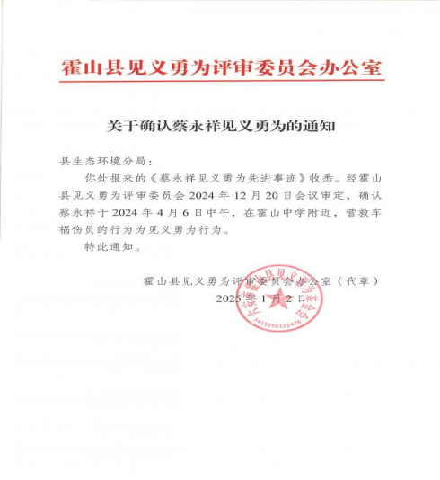 近日,从霍山县见义勇为评审委员会获悉,六安市霍山县生态环境分局生态环境综合执法大队副大队长、共产党员蔡永祥同志2024年4月6日在霍山中学附近营救车祸伤员的行为被确认为见义勇行为。